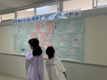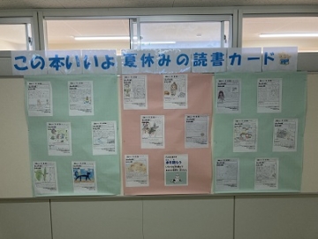 図書室前の掲示板には、夏休みに子どもたちが読んだ本の読書カードを掲示しています。本の感想も分かりやすく、絵もとっても上手で、思わず手にとって読みたくなるステキな読書カードばかりでした。保護者の方の心温まる一言もとても嬉しいです。お忙しい中、本当にありがとうございます。