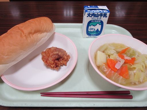 今日の献立は「とりにくのからあげ」「やさいスープ」「むぎめし」「牛乳」です。