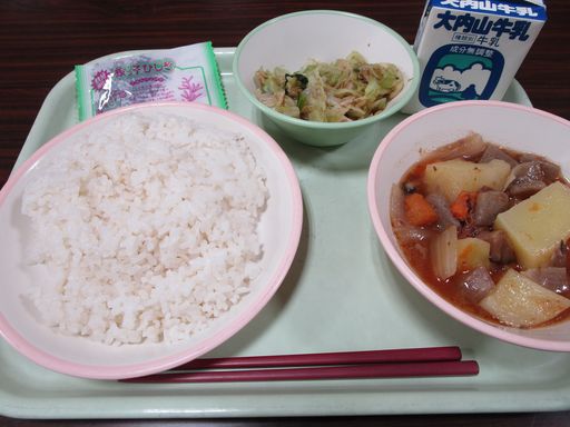 今日の献立は「にくじゃが」「あかかあえ」「ひじきふりかけ」「むぎめし」「ぎゅうにゅう」です。