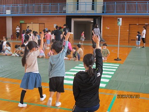 1年生は、信号機のある歩道で、安全な歩行を体験し横断歩道の歩き方を学びました。車が来る方向である右手を大きく挙げることや、右左右を確認することなどを教わりました。