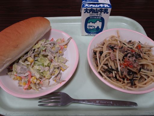 今日の献立は「ひじきのわふうスパゲッティ」「ごぼうサラダ」「げんりょうパン」「牛乳」です。