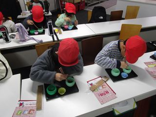 工場見学を終えた後、小豆を箸で皿から皿に移すゲームや出来立ての肉まんをいただいたりしました。