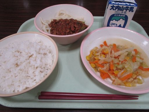 今日の献立は「にくみそうどん」「ちゅうかコーンサラダ」「むぎめし」「ぎゅうにゅう」です。