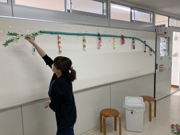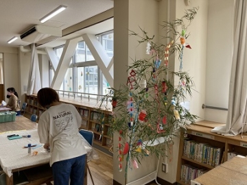 来月7月7日の七夕に向けて、図書ボランティアの皆さんと司書さんに、ステキな七夕かざりを作っていただきました。廊下には大きな笹かざり、そして図書室には本物の笹を用意していただきました。子どもたちからどんな願い事が出るか楽しみです。