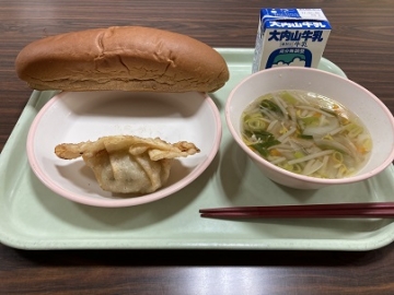 今日の給食は、子どもたちの大好きな「つギョウザ」です。「つギョウザ」は直径15cmの大きな皮で具を包み、油で揚げた大きな揚げギョウザです。1985年ごろから給食で出され始め、今でも子どもたちに大人気メニューの一つです。
