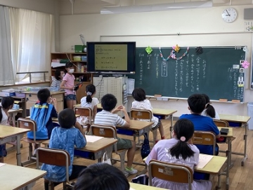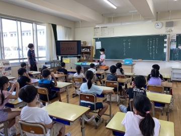 7月20日(火)の1限目に、一学期の終業式を全校放送で行いました。校歌、学校長からの話の後、生活委員会の人がタブレットを活用して、夏休みの過ごし方についてのクイズを出してくれました。