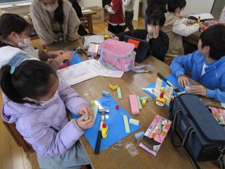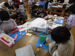 3年生が図工の「くぎうちトントン」で、木材に釘を打ったり色を塗ったりしながら、思い思いのものを制作していました。