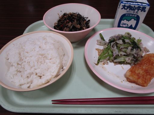 今日の献立は「いかのあまからあげ」「しそあえ」「ひじきのいりに」「むぎめし」「ぎゅうにゅう」です。