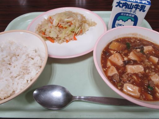 今日の献立は「あきなすいりマーボーどうふ」「バンサンスー」「むぎめし」「ぎゅうにゅう」です。