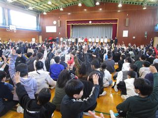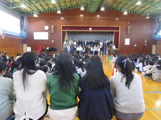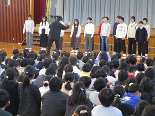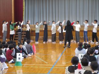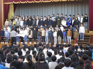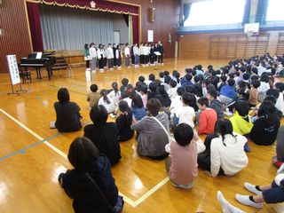 コンサートを開催してもらったお礼に6年生が「夢をかたちに」と「未来への賛歌」を歌って、津高校音楽部の皆さんにも聞いてもらいました。