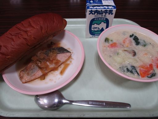 今日の献立は「さけのアップルソースかけ」「アレッタのとうにゅうチャウダー」「こくとうパン」「ぎゅうにゅう」です。