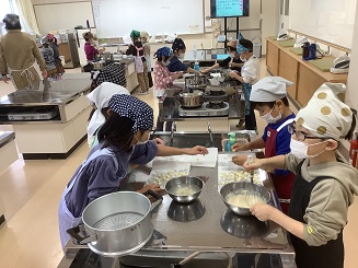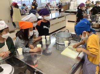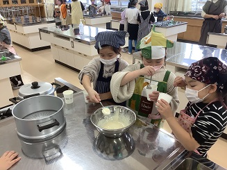 2年生は、学級園で収穫したサツマイモを使って「サツマイモ蒸しパン」を作りました。初めて包丁を使う子もいましたが、とても上手にサツマイモを切っていて、初めての調理体験でしたが、班のお友だちと協力しながら、どの子も楽しそうに蒸しパンづくりに取り組むことができました。出来上がった蒸しパンは、お世話になっている先生たちにもプレゼントしてくれました。「ありがとう、とっても美味しかったよ!」