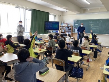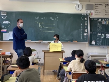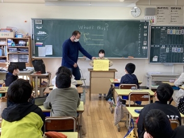 ALT(外国語指導助手)のジョン先生が、楽しいゲームを通して子どもたちを「英語で話したい!」という気持ちにさせてくれます。この日は、3年生が箱の中身を手探りで当てるゲームをしていました。例えば、箱の中身が「卓球のラケット」だと分かっても、英語では「何て言うんだろう?」と子どもたちの英語への関心も高まっていました。
