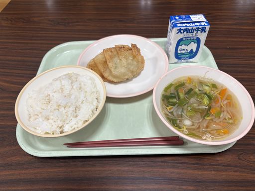 今日の献立は「つギョウザ」「はるさめスープ」「むぎめし」「ぎゅうにゅう」です。