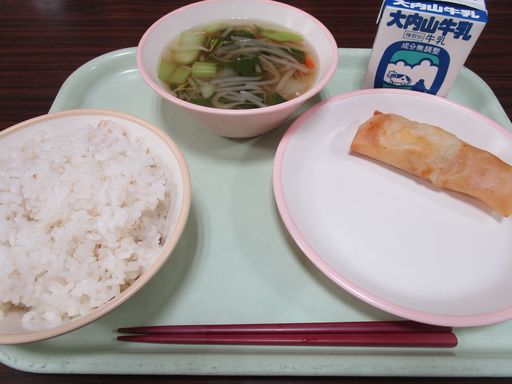 今日の献立は「チーズはるまき」「ちゅうかやさいスープ」「むぎめし」「ぎゅうにゅう」です。