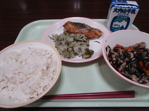 今日の献立は「さわらのたつたあげ」「こうやどうふとひじきのにもの」「しそあえ」「むぎめし」「ぎゅうにゅう」です。