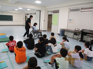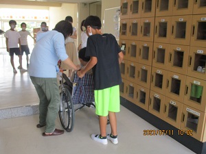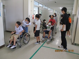 車いす体験では、見たことはあっても,実際に座って移動することが、初めての子が多く実際に座って移動してみると