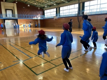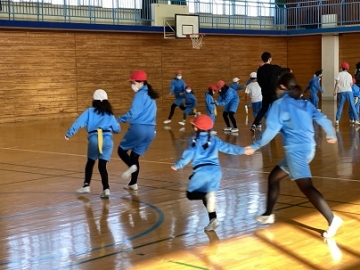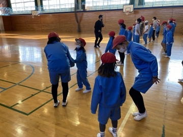 今日は、1年1組と6年1組が体育館で一緒に体育をしました。1年生は大喜びで、6年生に優しく教えてもらいながら、一緒に準備運動をしたり、しっぽ取りやドッチビーをしたりして楽しく交流できました。6年生が卒業する日も近づいてきたので、楽しい思い出をいっぱいつくっていきたいと思います。
