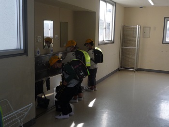 1年生は、朝から疲れを見せず元気に登校をしてきました。学校に着くと教室に入る前に、まず手洗いをして、感染防止対策を行っています。