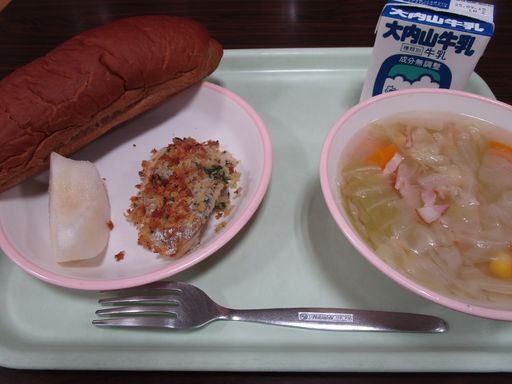 今日の献立は「さわらのパンこやき」「キャベツとコーンのスープ」「なし」「こくとうパン」「ぎゅうにゅう」です。