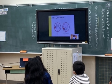 今日もZoomを使って、2年生を対象に、ヤナセクリニックの助産師さんから画面を通して「命の学習」についてお話していただきました。スライドを見ながら、命の始まりや赤ちゃんの誕生について詳しく説明していただきました。話の最後に、昨日生まれたばかりの赤ちゃんを見せていただくと、子どもたちから「わー!かわいいー!」と歓声が上がりました。