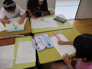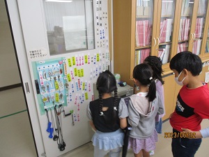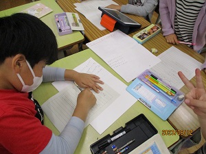 2年生が、学校にはどんな教室があるかなどを1年生に教えてあげる、生活科「学校あんない」で使う資料集めのために、職員室・校長室・特別教室などの写真をタブレットで撮っていました。資料集めを終えた子どもたちは、教室で当日の台本作りをみんなで相談しながら作っていました。昨年度自分たちがお兄さん・お姉さんに案内してもらった経験を思い出しながら、楽しそうに活動していました。