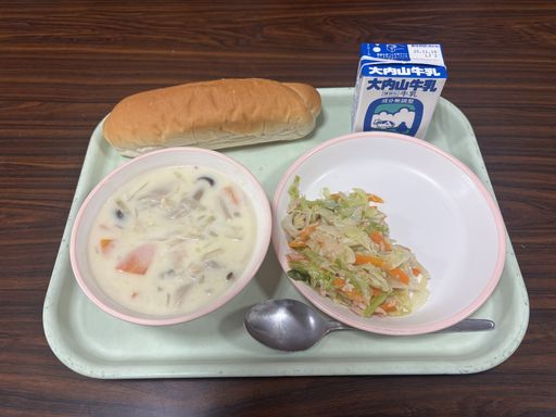 今日の献立は「あきのにぎわいシチュー」「ツナサラダ」「パン」「ぎゅうにゅう」です。