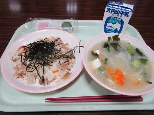 今日の献立は「ちらしずし」「しろみそしる」「さんしょくだんご」「ぎゅうにゅう」です。