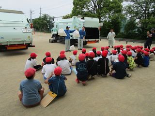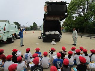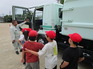 また、どのようにゴミが収集されているかを、実際にパッカー車を使って見せていただきました。