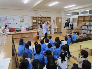 最初は「こんにちは としょかん」の本を使って、図書館の使い方や気をつけること等を教えていただきました。