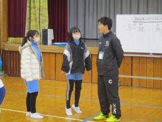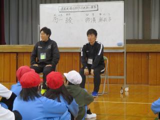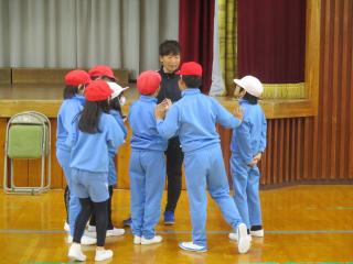 前半は、お二人から、「夢を持つことや、その夢に向かって努力することの大切さ」「仲間と協力することの大切さ」「感謝の心」などについての話をしていただきました。後半は、先生と子どもたちが協力して様々なゲームを行い、楽しみました。