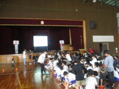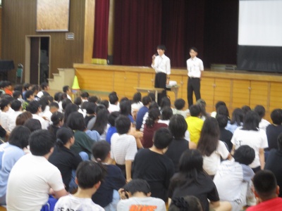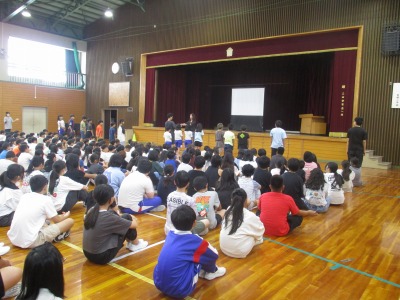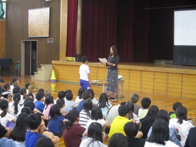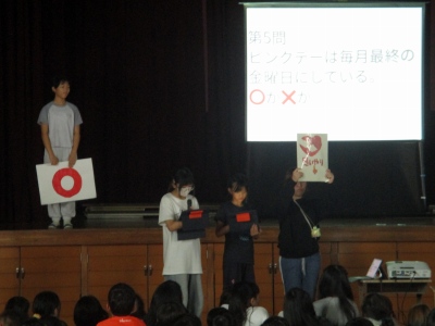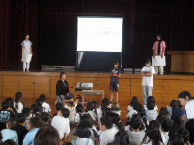 最後に、児童委員から、「白塚小学校をもっとよりよくするために」という目的でクイズがありました。また、相手を大事にすることやルールを守ることなどについてお話をしてくれました。