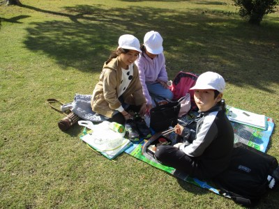 ミエムでは見学後、お弁当タイム。お天気がよかったので、しばふの上でみんなで食べました。