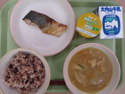 今日のメニューは、「むぎめし」「さばのいちみやき」「ごもくまめ」「こまつなときりぼしだいこんのいためもの」「ぎゅうにゅう」です。