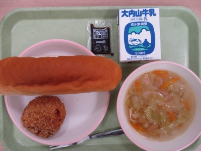 今日のメニューは、「こめこいりパン」「つコロッケ」「ジュリアンスープ」「ぎゅうにゅう」です。