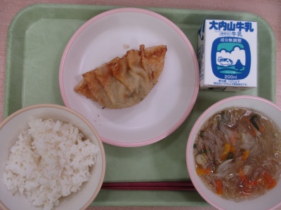 今日のメニューは、「むぎめし」「つギョウザ」「はるさめスープ」「ぎゅうにゅう」です。