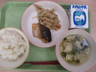 今日のメニューは、「むぎめし」「さばのしおやき」「おからのいりに」「ゆばのすましじる」「ぎゅうにゅう」です。