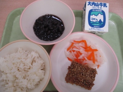 今日のメニューは、「むぎめし」「まつかぜやき」「くろまめ」「こうはくなます」「ぎゅうにゅう」です。