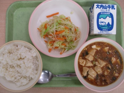 今日のメニューは、「むぎめし」「マーボーどうふ」「バンサンスー」「ぎゅうにゅう」です。