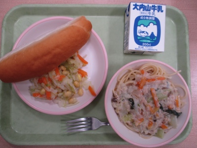 今日のメニューは、「ロールパン」「ツナとクリームスパゲッティ」「だいずサラダ」「ぎゅうにゅう」です。