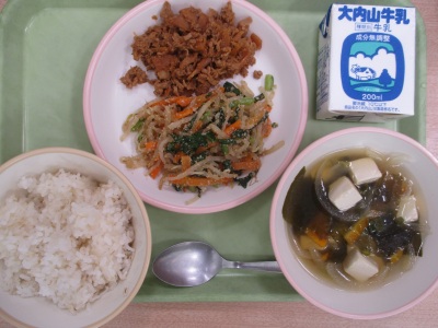 今日のメニューは、「ビビンバ」「とうふとわかめのスープ」「ぎゅうにゅう」です。