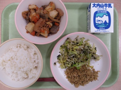 今日のメニューは、「むぎめし」「さといものそぼろに」「いそかあえ」「ツナふりかけ」「ぎゅうにゅう」です。