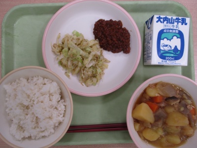 今日のメニューは、「むぎめし」「にくじゃが」「なっとうみそ」「ごましおキャベツ」「ぎゅうにゅう」です。