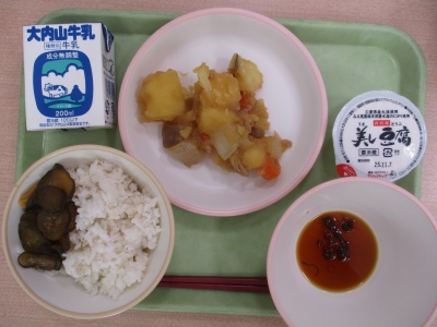 今日のメニューは、「むぎめし」「ひややっこ」「にくじゃが」「きゅうりづけ」「ぎゅうにゅう」です。