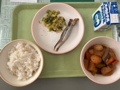 今日のメニューは、「むぎめし」「やきししゃも」「みそおでん(うずらたもごいり)」「はくさいのごまあえ」「ぎゅうにゅう」です。