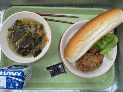 今日のメニューは、「ロールパン」「サーモンコロッケ」「そえレタス」「わかめスープ」「ぎゅうにゅう」です。