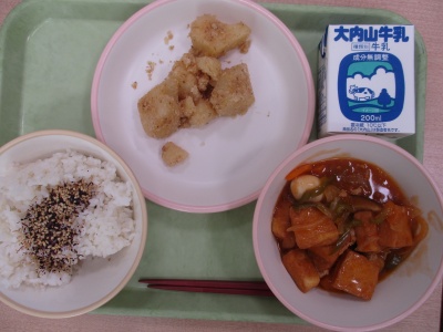 今日のメニューは、「むぎめし」「あつあげとうずらたまごのあまずあん」「じゃがいものおかかまぶし」「しそとごまのふりかけ」「ぎゅうにゅう」です。