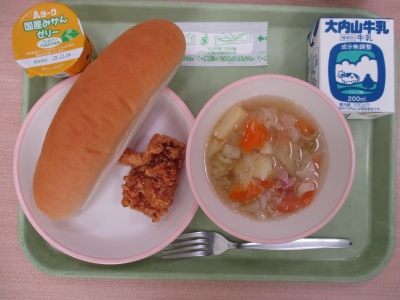 今日のメニューは、「ロールパン」「とりにくのからあげ」「やさいスープ」「みかんゼリー」「ぎゅうにゅう」です。