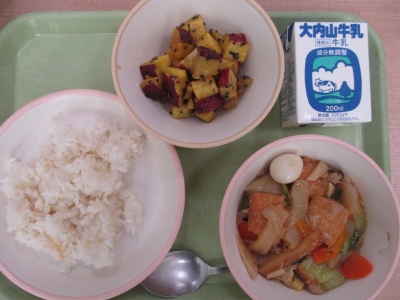 今日のメニューは、「ちゅうかはん(うずらたまごいり)」「だいがくいも」「ぎゅうにゅう」です。