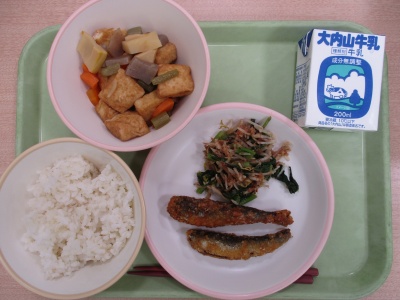 今日のメニューは、「むぎめし」「いわしのからあげ」「はるやさいのにもの」「おかかかえ」「ぎゅうにゅう」です。